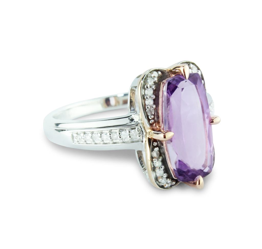 Breathtaking Pink Amethyst Ring With 34 Sparkling Diamonds (1/8 carat) set in Sterling Silver (925) and 10K Rose (Pink) Gold