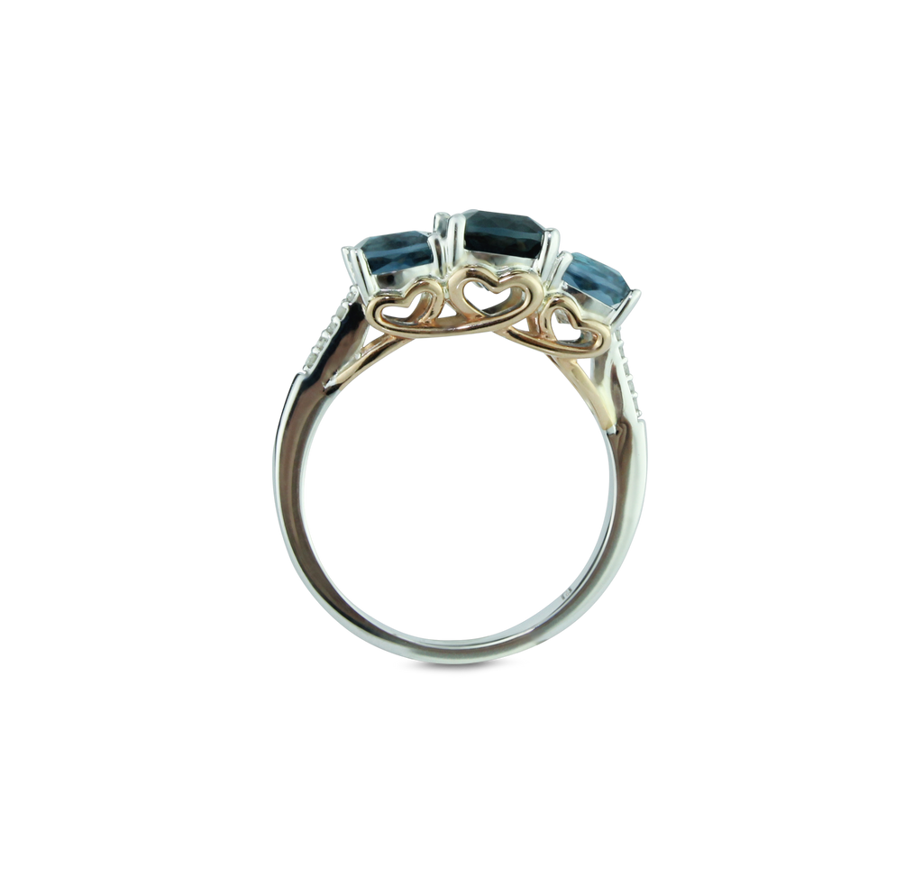 Gorgeous London Blue Topaz & Swiss Blue Topaz Ring, 3 Large Gems, 10 Brilliant Diamonds, 10K Rose Gold & 925 Sterling Silver, Heart Design