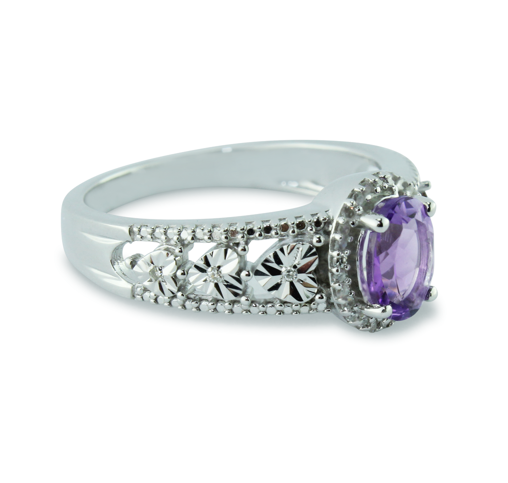Sparkling Oval Amethyst Gemstone and 1/15 cttw Diamond Ring & In 925 Sterling Silver, With Heart Design And 32 Diamonds