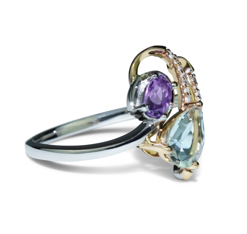 Elegantly Crafted Diamond, Pink & Green Amethyst Gemstone Ring With 19 Diamonds, Pear Shaped Gems, Set In 10K White And Rose Gold Setting